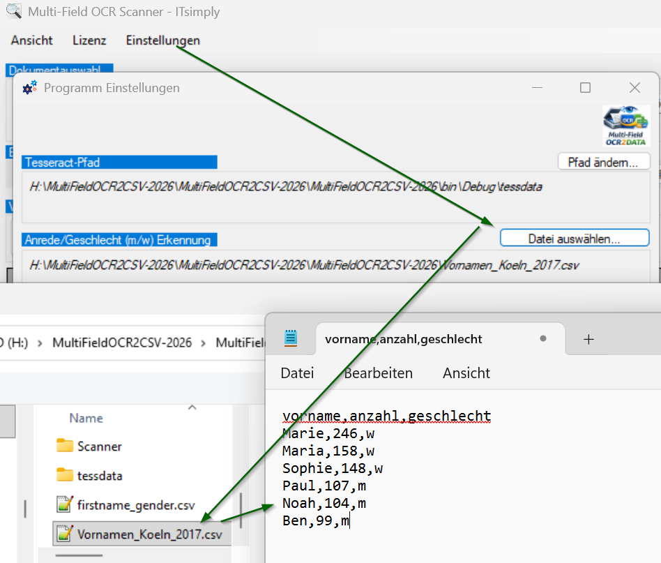 Zuvor in den Programm Einstellungen sicherstellen, dass eine Liste, mit Vornamen und dem zugehörigen Geschlecht als Referenz/Nachschlagewerk eingestellt ist.